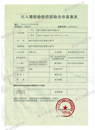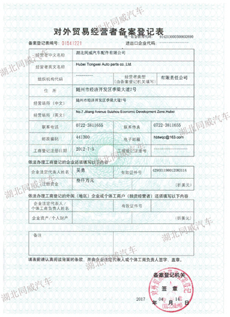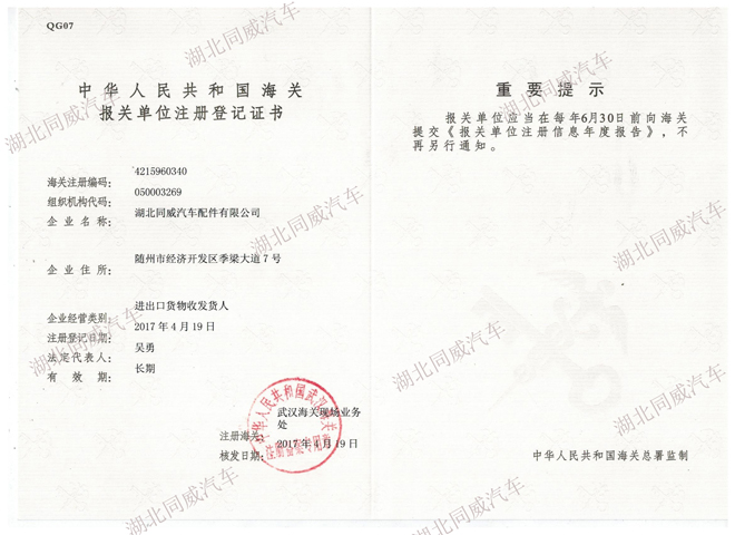 湖北同威汽車公司近日已完成了出口資質(zhì)的相關(guān)備案登記,包括對(duì)外貿(mào)易經(jīng)營者備案登記,海關(guān)報(bào)關(guān)單位注冊(cè)登記、電子口岸入網(wǎng)、外匯收支備案、出入境檢驗(yàn)檢疫報(bào)檢企業(yè)備案、退(免)稅備案等,現(xiàn)在已經(jīng)可以開始正常合規(guī)的開展專用汽車和配件的進(jìn)出口業(yè)務(wù)。