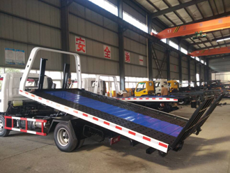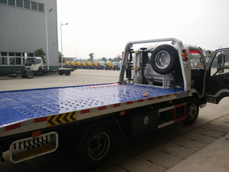 該車平板長度為5.3米(含液壓伸縮加長部份),寬2.22米,3P2A折疊沖壓式平板,帶100CM液壓伸縮式可加長平板。該車采用國標(biāo)優(yōu)質(zhì)碳鋼花紋板制作,平板由多塊壓制預(yù)壓板組成,10根加強(qiáng)型槽鋼橫梁固定,既減輕了整車重量,又增加了托舉和裝載能力。 大承載質(zhì)量為2.5噸,平板 小傾斜角為8度,托舉系統(tǒng)額定托舉質(zhì)量為1.2噸,采用1個(gè)4噸液壓絞盤,加粗鋼絲繩20米,一個(gè)工具箱,一個(gè)洗手箱,該車配備6個(gè)綁帶,鏈鉤一條,可選裝LED長排警燈。