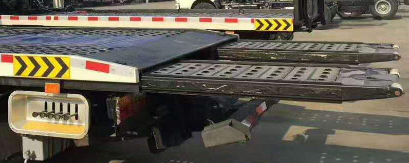 (1)老款伸縮尾板:一拖二型(3P1)沖壓式平板,板上開孔,平板長度為4.2-4.3米,寬2.3米,后部一塊1米長的液壓伸縮尾板,加裝前配重。雙側(cè)聯(lián)動操作裝置,1個4噸液壓絞盤(25米鋼絲繩),1~2個工具箱(根據(jù)底盤空間制作),L型托叉一對,拖叉一對,拖叉座一對,擋胎2個,2個輔助輪小車,4根綁帶,一個洗手箱,鏈鉤一條,帶液壓自動式伸縮尾板,加前配重,帶后托舉(可選擇不帶后托舉)。