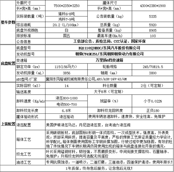 | 罐體外形尺寸:4800×2300×1850(mm);罐體有效容積:11.2立方米;隨底盤選裝駕駛室.1.防護(hù)材料:Q235,連接方式:側(cè)/后防護(hù)材料為Q235,均為焊接連接;后防護(hù)截面尺寸230×60mm,下邊緣離地高450mm;2.后伸量:200mm;3.采用CY4SK251,ISF3.8s5154,YC4S150-50,4DX23-140E5,YN38CRE1發(fā)動(dòng)機(jī),油耗值分別為(L/100km):23.6,24.0,24.2,24.8,24.7;4.ABS系統(tǒng)生產(chǎn)廠家,型號(hào) :襄陽東風(fēng)隆誠(chéng)機(jī)械有限責(zé)任公司,ABS/ASR-24V-4S/4M;5.該車專用裝置為絞龍,用于運(yùn)輸散裝飼料.選裝電動(dòng)輸料系統(tǒng)結(jié)構(gòu). |