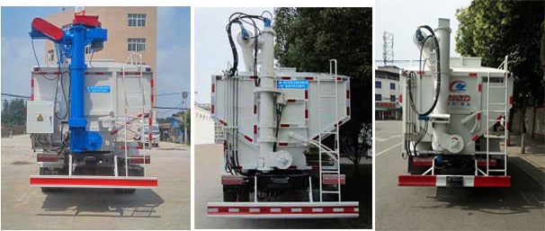 上裝配置:罐體材質(zhì)采用4mm優(yōu)質(zhì)碳鋼板,整車(chē)3條絞龍,由3個(gè)5.5KW電機(jī)帶動(dòng),頂部絞龍用液壓控制舉升,可左右旋轉(zhuǎn)180度,罐體可根據(jù)用戶要求做多個(gè)獨(dú)立分倉(cāng),可以獨(dú)立控制各分倉(cāng)卸料順序和速度。